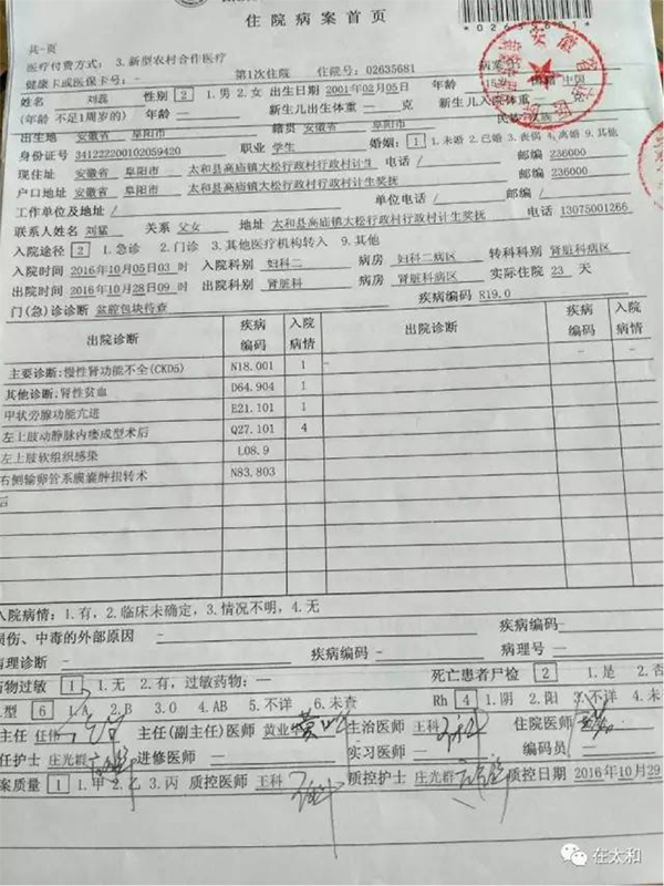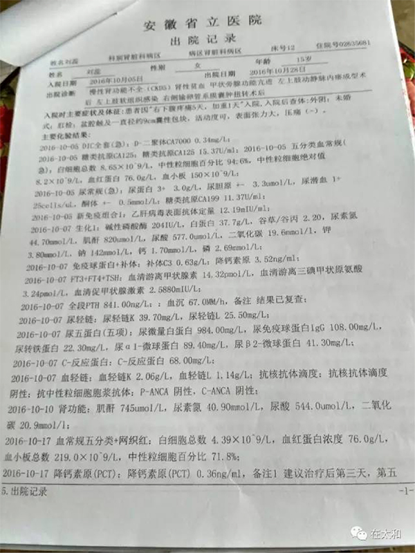 2016年3月7號的清晨,一向聽話乖巧的大女兒蕊蕊沒有像往常一樣早起上學,而是打電話給我說自己肚子很痛,我急忙趕去帶著蕊蕊去了太和縣人民醫(yī)院,經過一番診斷和系統(tǒng)的檢查,最后診斷是卵巢囊腫??删彤斠磺卸及才藕昧耍锶镆部梢允中g的時候,噩耗再次傳來,術前檢查發(fā)現(xiàn)蕊蕊的肌酐高達600多,已經需要透析治療。直到現(xiàn)在依然無法接受,才十五歲的女孩,竟然患上了尿毒癥。