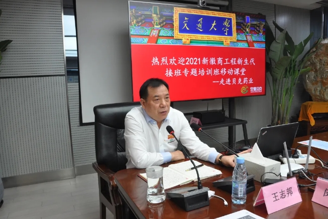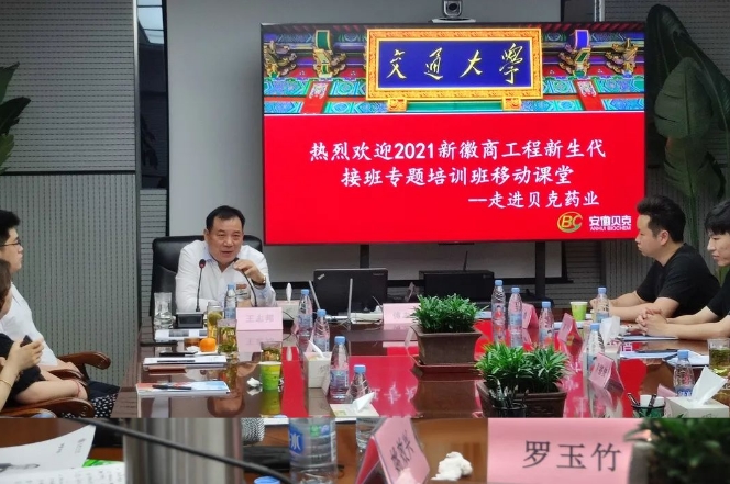 本次移動(dòng)課堂由上海交通大學(xué)安泰經(jīng)濟(jì)與管理學(xué)院教授羅守貴,上海交通大學(xué)國(guó)際電子商務(wù)客座教授傅志勇致專(zhuān)題講座,貝克集團(tuán)董事長(zhǎng)王志邦受邀就《傳承徽商精神》進(jìn)行主題分享,貝克原料藥基地常務(wù)副總王猛,貝金基因總經(jīng)理王倩倩,貝克集團(tuán)總裁助理陳小峰參加研修班交流活動(dòng)。
